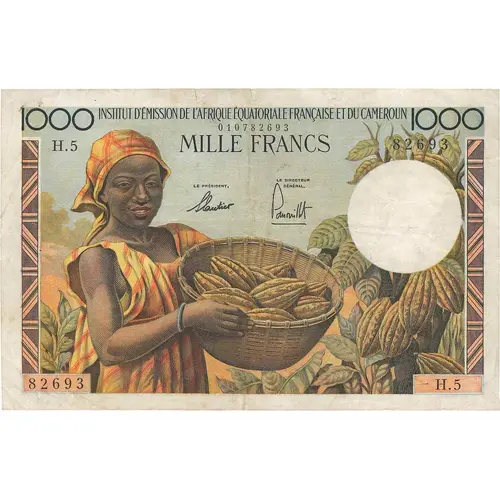 INSTITUT D`EMISSION DE L`AFRIQUE ÉQUATORIALE FRANÇAISE ET DU CAMEROUN MILLE FRANCS (Translation: Institute of Emission of French Equatorial Africa and Cameroon Thousand Francs) |