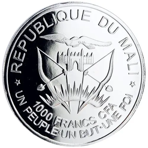⋆ REPUBLIQUE DU MALI ⋆ 1000 FRANCS CFA UN PEUPLEUN BUTUNE FOI (Translation: Republic of Mali One People, One Goal, One Faith) |