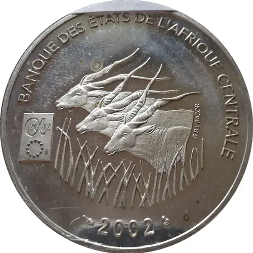 | Obverse lettering | BANQUE DES ÉTATS DE L`AFRIQUE CENTRALE G.B.L.BAZOR 2002 |