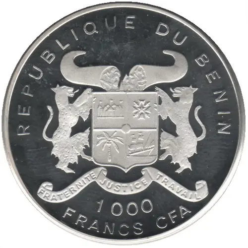 | Obverse lettering | REPUBLIQUE DU BENIN FRATERNITE JUSTICE TRAVAIL 1000 FRANCS CFA |