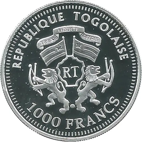 | Obverse lettering | REPUBLIQUE TOGOLAISE RT 1000 FRANCS (Translation: Togolese Republic Labour Freedom Homeland) |