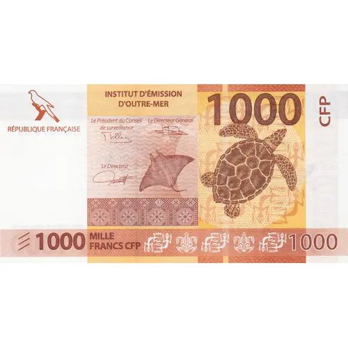 INSTITUT D`ÉMISSION D`OUTRE-MER 1000 MILLE FRANCS CFP REPUBLIQUE FRANÇAISE (Translation: Overseas Note-Issuing Bank One Thousand Francs CFP French Republic.) |