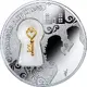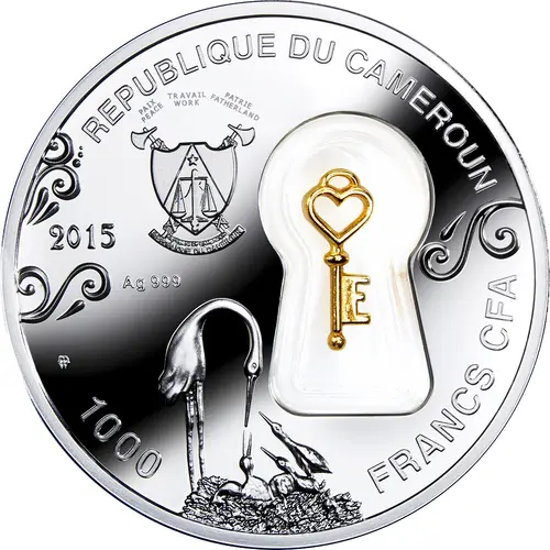 Coat of arms of Cameroon at upper left, golden key at right, stork with chicks at bottom. |