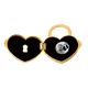 Golden key at left, house at upper right, silhouette of man and woman at right. |
