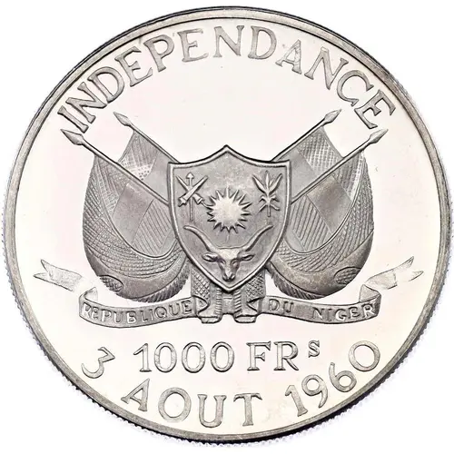 Historical Context: The 1960 Niger 1000 Francs Independence coin commemorates a profound moment in West African history: the nation's full sovereignty from French colonial rule. Issued in the pivotal "Year of Africa," this coin celebrates the birth of the First Republic of Niger under President Hamani Diori. It symbolizes Niger's transition from a French territory to an independent state, embodying the aspirations of a nascent nation building its future and establishing a new national identity.