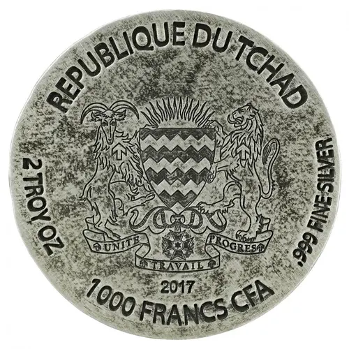 REPUBLIQUE DU TCHAD UNITE TRAVAIL PROGRES 2017 2 TROY OZ 1000 FRANCS CFA .999 FINE SILVER (Translation: Republic of Chad Union Work Progress) |