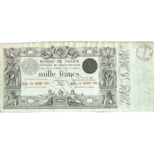 | Obverse lettering | BANQUE DE FRANCE mille francs. BARRE FECIT |