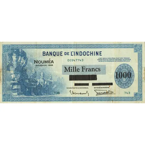 BANQUE DE L`INDOCHINE NOUMÉA EMISSION 1944 L`article 139 du Code Pénal punit des travaux forcés ceux qui auront contrefait ou falsifié les billets de banques autorisées par la loi. Mille Francs 1000 LE DIRECTEUR DE LA SUCURSALE. UN FONDE DE POUVOIRS. (Translation: Bank of Indochina Noumea 1944 Issue Article 139 of the Penal Code punished by forced labor perpetuity of those who have counterfeit or falsified these vouchers as well as those who have made use of these vouchers counterfeit or falsified. Thousand Francs The Director of the Branch. A Foundation of Powers.) |