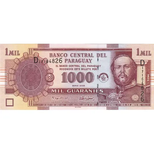 | Obverse lettering | BANCO CENTRAL DEL PARAGUAY EL BANCO CENTRAL DEL PARAGUAY RECONOCE ESTE BILLETE POR 1000 SERIE 2005 MIL GUARANIES ESTE BILLETE TIENE CURSO LEGAL Y FUERZA CANCELATORIA ILIMITADA EN TODO EL TERRITORIO DE LA REPUBLICA (LEY Nº 489 DEL 29 DE JUNIO DE 1995). (Translation: Central Bank of Paraguay The Central Bank of Paraguay acknowledges this banknote for One Thousand Guaranies Series 2005 This banknote is legal tender and has unlimited cancellation value all over the Republic territory. (Law# 489 from June 29th., 1995).) |