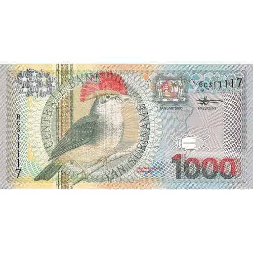| Ön yüz lejandı | CENTRALE BANK VAN SURINAME 1 JANUARY 2020 Onychorhynchus coronatus 1000 (Translation: Central Bank of Suriname January 1st, 2020 Onychorhynchus coronatus 1000) |
