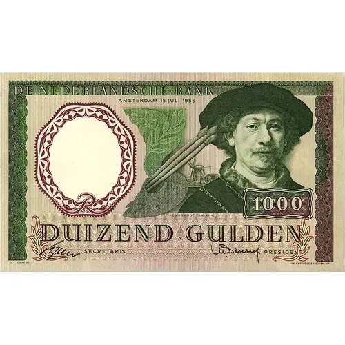 DE NEDERLANDSCHE BANK AMSTERDAM 15 JULI 1956 1000 DUIZEND GULDEN J.F. DOEVE DEL JOH. ENSCHEDÉ EN ZONEN IMP (Translation: Bank of the Netherlands Amsterdam July 15, 1956 1000 One Thousand Gulden J.F. Doeve Del Joh. Enschedé and Sons Imp) |