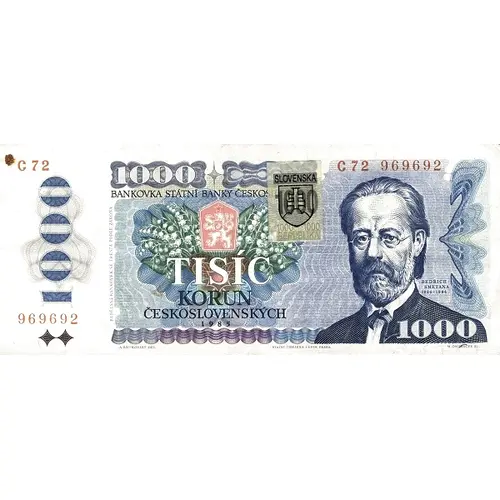 1000 BANKOVKA STÁTNÍ BANKY ČESKOSLOVENSKÉ TISÍC KORUN ČESKOSLOVENSKÝCH 1985 BEDŘICH SMETANA 1824-1884 PADĚLÁNÍ BANKOVEK SE TRESTÁ PODLE ZÁKONA A. BRUNOVSKÝ DEL. STÁTNÍ TISKÁRNA CENIN, PRAHA M. ONDRÁČEK SC. |