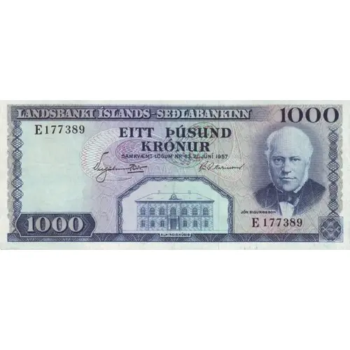 | Obverse lettering | LANDSBANKI ÍSLANDS - SEÐLABANKI ÍSLANDS 1000 EITT ÞÚSUND KRÓNUR SAMKVÆMT LÖGUM NR. 63. 21. JÚNÍ 1957 JÓN SIGURDSSON 1000 (Translation: 1000 Krónur According to Law No 63. 21. June 1957) |