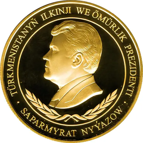 | Obverse lettering | TÜRKMENISTANYŇ ILKINJI WE ÖMÜRLIK PREZIDENTI ∙ SAPARMYRAT NYÝAZOW ∙ (Translation: The first and lifelong President of Turkmenistan Saparmurat Niyazov) |