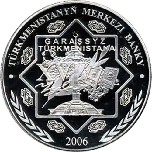 | Obverse description | The Rub el Hizb (a Muslim symbol, represented as two overlapping squares), the Independence Monument, two books of the Rukhnama and olive branches on a background map of Turkmenistan. |