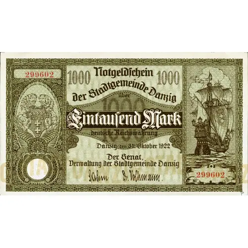 Notgeldſchein der Stadtgemeinde Danzig über Fünfhundert Mark Deutſsche Reichswährung Danzig, den 31. Oktober 1922 Der Senat, Verwaltung der Stadtgemeinde Danzig |