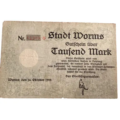 | Obverse lettering | Stadt Worms Gutschein über Tausend Mark Dieser Gutschein wirf von allen städtischen Kassen in Zahlung genommen.Er verliert feine Gültigkeit mit dem Zeitpunkt,der demnächst tun der Woermser Zeitungen öffentlich bekannt gemacht wird.Die Stadt haftet für Ride Einlösung .Der Oberbürgermeister Worms,den 16 Oktober 1922 |
