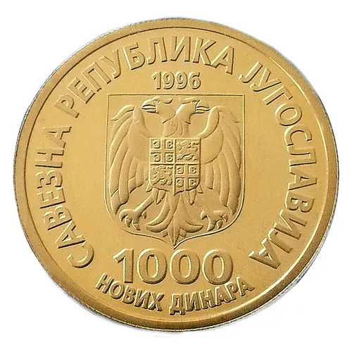 | Legenda awersu | САВЕЗНА РЕПУБЛИКА ЈУГОСЛАВИЈА 1996 1000 НОВИХ ДИНАРА (Translation: Federal Republic of Yugoslavia 100 New Dinars) |