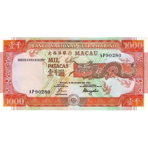 BANCO NACIONAL ULTRAMARINO 大西洋銀行 MACAU DECRETO-LEI № 68/88/M, DE 8 DE AGUSTO DECRETO-LEI № 41/91/M, DE 8 DE JULHO MIL PATACAS 壹千圓 MACAU, 8 DE JULHO DE 1991 CONSELHO DE ADMINISTRAÇÃO / DIRECTOR-GERAL DO DEPARTAMENTO DE MACAU ADMINISTRATOR |