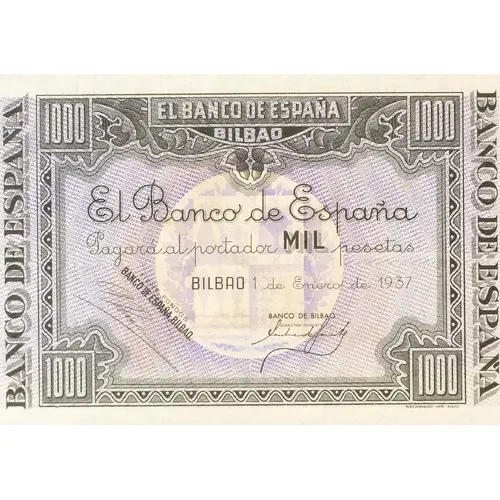 | Obverse lettering | 1000 EL BANCO DE ESPAÑA / BILBAO El Banco de España Pagará al portador MIL pesetas BILBAO 1 de Enero de 1937 (Translation: The Bank of Spain / Bilbao The Bank of Spain Will pay the bearer One Thousand Pesetas Bilbao January 1, 1937) |