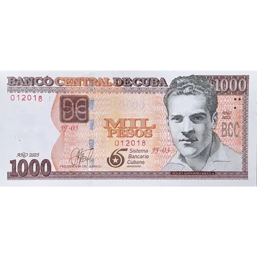 | Ön yüz lejandı | BANCO CENTRAL DE CUBA 1000 MIL PESOS BCC AÑO 2025 Sistema Bancario Cubano ANIVERSARIO 1000 PRESIDENTE DEL BANCO JULIO ANTONIO MELLA (Translation: Central Bank of Cuba 1000 One Thousand Pesos. Year 2025 Anniversary of the Cuban banking system Bank`s President Juan Antonio Mella) |