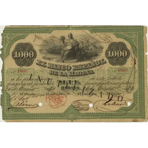 | Obverse lettering | 1000 EL BANCO ESPAÑOL DE LA HABANA á la presentación de este billete pagará al portador MIL pesos fuertes en efectivo. Habana, 26 de Enero de 1870. (Translation: The Spanish Bank of Havana Upon presentation of this note, the bearer will be paid One Thousand Pesos Fuertes in cash. Havana, January 26, 1870.) |