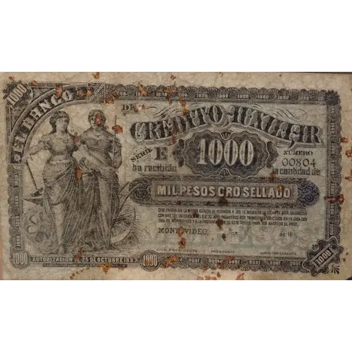 | Obverse lettering | 1000 EL BANCO DE CRÉDITO AUXILIAR HA RECIBIDO LA CANTIDAD DE MIL PESOS ORO SELLADO QUE PAGARA EN LA MISMA ESPECIE A LOS 12 MESES DE LA FECHA DE ESTA OBLIGACION CON MAS LOS INTERESES DEL 8% AL AÑO PAGADEROS POR TRIMESTRES VENCIDOS EN LA CASA CEN TRAL DE MONTEVIDEO Y Á LA PRESENTACION DE ESTE TITULO PARA SER ANOTADO EL PAGO. MONTEVIDEO, DE DE 18 AUTORIZACION DE 25 DE OCTUBRE DE 1887 (Translation: 1000 The Auxiliary Credit Bank has received the amount of one thousand Pesos in sealed gold, that will pay in the same specie at 12 months from the date of this obligation, adding the interest of 8% by year, to be paid on full quarters at Montevideo head branch, on presentation of this title to be filed payment. Montevideo _____ Authorization from October 25th., 1887) |