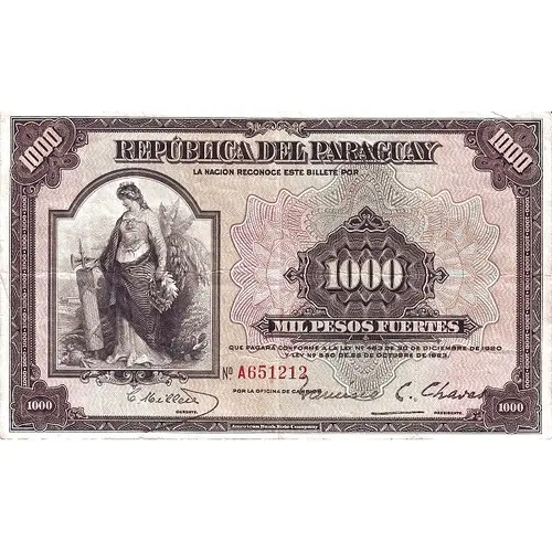 | Obverse lettering | Republica del Paraguay LA NACION RECONOCE ESTE BILLETE POR 1000 MIL PESOS FUERTES QUE PAGARA CONFORME A LA LEY Nº 463 DE 30 DE DECIEMBRE DE 1920 Y LEI Nº 550 DE 25 DE OCTUBRE DE 1923. POR LA OFICINA DE CAMBIOS (Translation: Republic of Paraguay The Nation Recognizes this Banknote by One Thousand Pesos Fuertes that you will pay in accordance with Law no. 463 of December 30, 1920 and Law no. 550 of October 25, 1923 for the Exchange Office) |