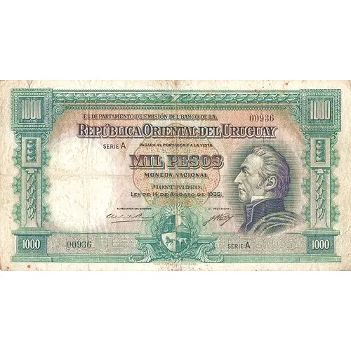 | 正面铭文 | EL DEPARTAMENTO DE EMISIÓN DEL BANCO DE LA REPÚBLICA ORIENTAL DEL URUGUAY PAGARÁ AL PORTADOR Y A LA VISTA MIL PESOS MONEDA NACIONAL Montevideo, Ley de 14 de Agosto de 1935 (Translation: The issuance department of the Bank of the Oriental Republic of Uruguay Will pay to the bearer and at sight One thousand Pesos National currency Montevideo, Law of Aug. 14th., 1935) |