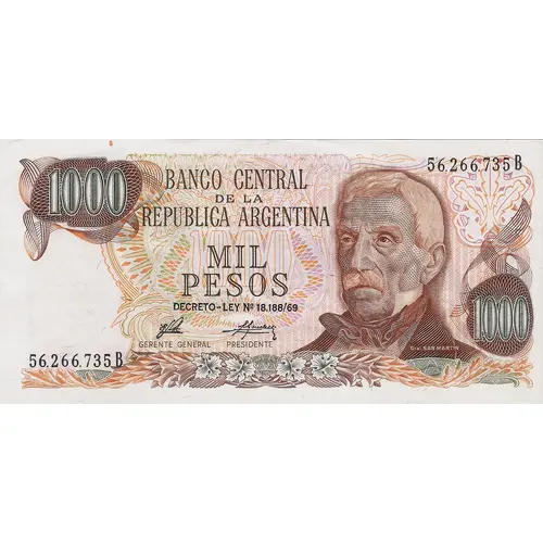 | Obverse lettering | Banco Central de la República Argentina Mil Pesos Decreto-Ley 18.188 (Translation: Central Bank of the Argentinian Republic One Thousand Pesos Decree-Law 18,188) |