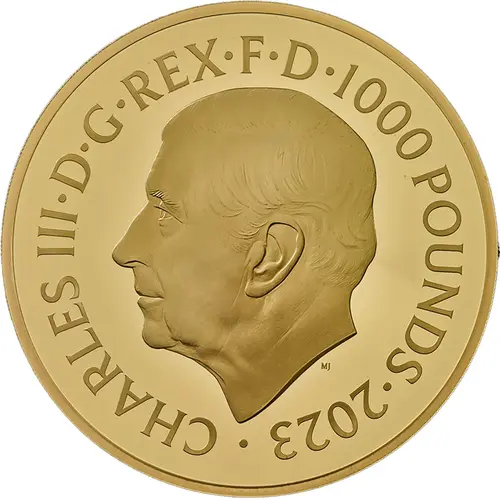| Надписи аверса | CHARLES III·D·G·REX·F·D·1000 POUNDS·2023· MJ (Translation: Charles the Third by the Grace of God King Defender of the Faith) |