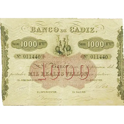 | Obverse lettering | BANCO DE CADIZ SON 1000 Rs. Von. El Banco tiene a disposición del portador MIL REALES VELLÓN en efectivo EL COMISARIO REGIO / EL DIRECTOR / EL INTERVENTOR / EL CAJERO (Translation: Bank of Cádiz It`s 1000 Rs. Von. The Bank has at the disposal of the bearer One Thousand Reales Vellón in cash The Royal Commissioner / The Director / The Controller / The Cashier) |