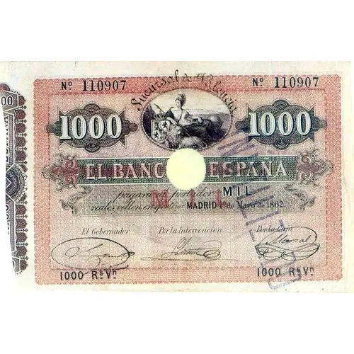 1000 EL BANCO DE ESPAÑA pagará al portador MIL reales vellón en efectivo MADRID 1º de Mayo de 1862. El Gobernador Por la Intervencion Por la Caja (Translation: The Bank of Spain will pay the bearer One Thousand Reales vellon in cash Madrid, May 1, 1862. The Governor For the Intervention For the Cash) |