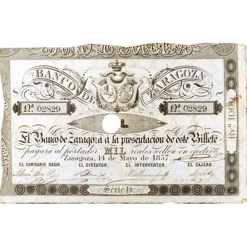 BANCO DE ZARAGOZA MIL El Banco de Zaragoza a la presentación de este Billete pagará al portador MIL reales vellon en efectivo Zaragoza, 14 de Mayo de 1857 EL COMISARIO REGIO / EL DIRECTOR / EL ADMINISTRADOR / EL CAJERO (Translation: Bank of Zaragoza One Thousand The Bank of Zaragoza upon presentation of this banknote will pay the bearer One Thousand Reales Vellon in cash Zaragoza, May 14, 1857 The Royal Commissioner / The Director / The Administrator / The Cashier) |