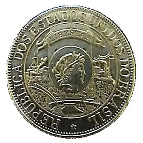 | Obverse description | In the center, the head of a woman embodying the Republic under a banner inscribed `LIBERTAS`, with a ship and locomotive on the sides and plowed down, which were intended to represent the progress in which Brazil was already entering, mainly due to the recent proclamation of the Republic; all bordered by the inscription `REPUBLICA DOS ESTADOS UNIDOS DO BRASIL`. |