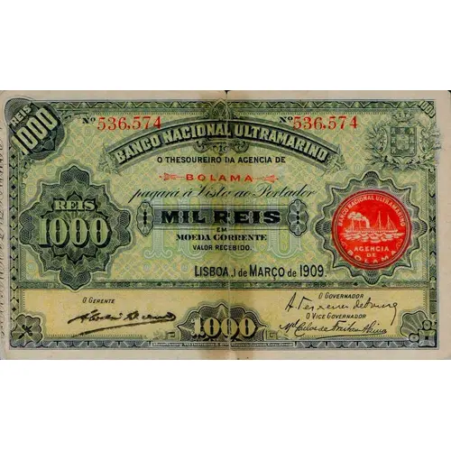 BANCO NACIONAL ULTRAMARINO O THESOURERIO DA AGENCIA DE BOLAMA PAGARA A VISTA A PORTADOR MIL REIS EM MOEDA CORRENTE VALOR RECIBIDO LISBOA, I DE MARÇO DE 1909. (Translation: Ultramarine National Bank the Treasurer of the Agency of Bolama pay to the bearer Thousand Reis in currency amount received Lisbon, March 1, 1909.) |