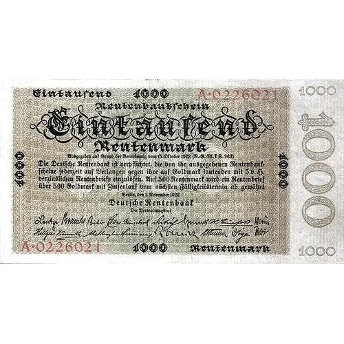| Obverse lettering | Rentenbankschein Eintausend Rentenmark Ausgegeben auf Grund der Vorordnung vom 15. Oktober 1923 (R.-G.-Bl. I S. 963) Die Deutche Rentenbank ist verplichtet, die von ihr ausgegebenen Rentenbankscheine jederzeit auf Verlangen gegen ihre auf Goldmarklautenden mit 5 v. H. verzinslichen Rentenbriefe einzulösen. Auf 500 Rentenmark wird ein Rentenbrief über 500 Goldmark mit zinsenlauf vom nächsten fälligkeitstermin ab gewährt. Berlin, den 1. November 1923 Deutsche Rentenbank Der Verwaltungsrat (Translation: Rentenbank Note One Thousand Rentenmark Issued according to the order of the 15th of October 1923 The German Rentenbank is obliged to exchange the Rentenbank notes it has issued, at any time upon request, for its Goldmark denominated 5% interest-bearing annuity letters. For every 500 Rentenmark, a bond is granted for 500 Goldmark with interest accruing from the next due date. Berlin, 1st November 1923 German Rentenbank Board of Directors) |