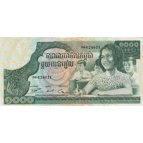 BANQUE NATIONALE DU CAMBODGE 1000 MILLE RIELS (Translation: National bank of Cambodia One thousand riels) |