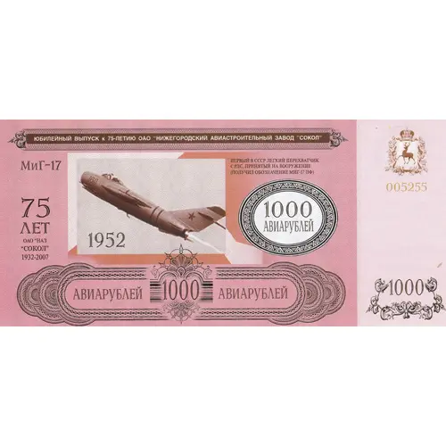 | Obverse lettering | ЮБИЛЕЙНЫЙ ВЫПУСК К 75-ЛЕТИЮ OAO `НИЖЕГОРОДСКИЙ АВИАСТРОИТЕЛЬНЬІЙ ЗАВОД `СОКОЛ` ПЕРВЫЙ В СССР ЛЕГКИЙ ПЕРЕХВАТЧИК С РЛС, ПРИНЯТЫЙ НА ВООРУЖЕНИЕ (ПОЛУЧИЛ ОБОЗНАЧЕНИЕ МИГ-17 ПФ) МиГ-17 75 ДЕТ ОАО `НАЗ `CОKOЛ` 1932-2007 АВИАРУБЕЙ 1000 АВИАРУБЕЙ (Translation: ANNIVERSARY ISSUE FOR THE 75TH ANNIVERSARY OF THE NIZHNY NOVGOROD AIRCRAFT PLANT `SOKOL` THE FIRST LIGHT INTERCEPTOR WITH RADAR IN THE USSR, ACCEPTED FOR SERVICE (WAS DESIGNED MIG-17 PF) MiG-17 75 `FALCON` 1932-2007 AVIATION ROUBLES 1000 AVIATION ROUBLES) |