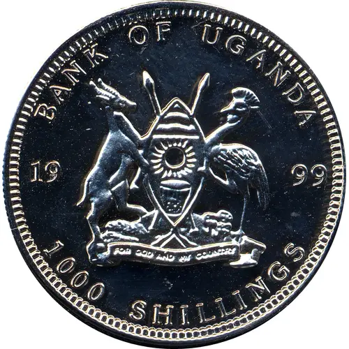 | Legenda del dritto | BANK OF UGANDA 19 99 FOR GOD AND MY COUNTRY 1000 SHILLINGS |