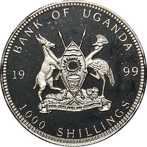 | Obverse lettering | BANK OF UGANDA 1999 FOR GOD AND MY COUNTRY 1000 SHILLINGS |