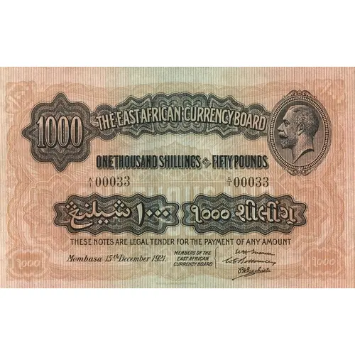 | Obverse lettering | THE EAST AFRICAN CURRENCY BOARD ONE THOUSAND SHILLINGS OR FIFTY POUNDS THESE NOTES ARE LEGAL TENDER FOR THE PAYMENT OF ANY AMOUNT |