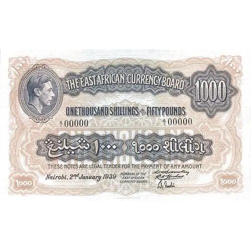 | Obverse lettering | THE EAST AFRICAN CURRENCY BOARD ONE THOUSAND SHILLINGS OR FIFTY POUNDS THESE NOTES ARE LEGAL TENDER FOR THE PAYMENT OF ANY AMOUNT NAIROBI |