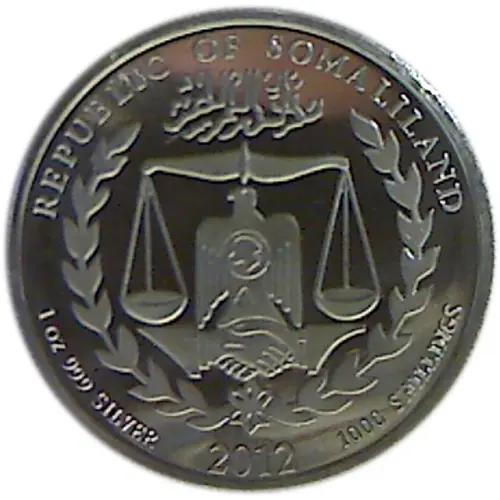 | Obverse lettering | REPUBLIC OF SOMALILAND 1 OZ 999 SILVER 2012 1000 SHILLINGS |