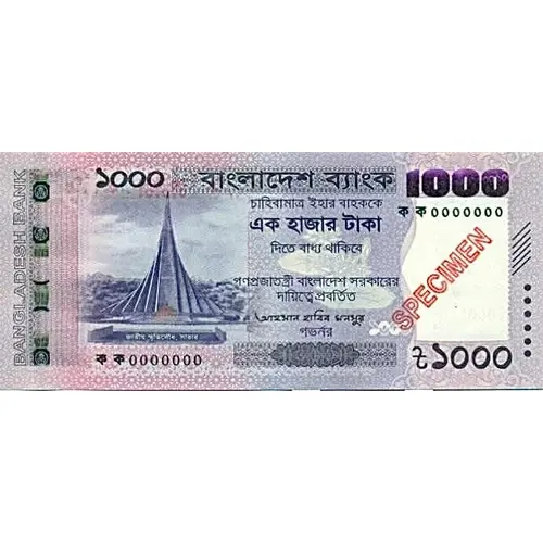 | Reverse description | The design on the back of the note is the image of the National Parliament Building, Dhaka. The denomination `1000` is printed on the top left corner of the note and the `Monogram of Bangladesh Bank` is printed on the right corner, and the denomination `1000` is printed on the bottom right corner and left corner. In addition, `1000` is printed vertically on the right side of the note. |