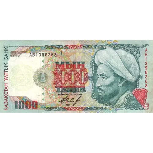 (Translation: Counterfeiting banknotes is punished by law, National Bank of Kazakhstan, One Thousand Teñge, National Bank of Kazakhstan, Äl-Farabï - year 870-950)