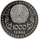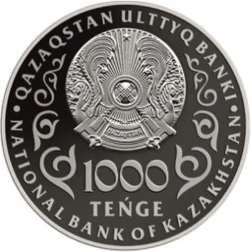 | Описание аверса | The State Emblem of the Republic of Kazakhstan is depicted in the central part. To the left and to the right of it are elements of the national ornament. Along the circumference - the inscriptions QAZAQSTAN ULTTYQ BANKI NATIONAL BANK OF KAZAKHSTAN. At the bottom of the coin there is an inscription indicating the denomination of 1000 TEŃGE. |