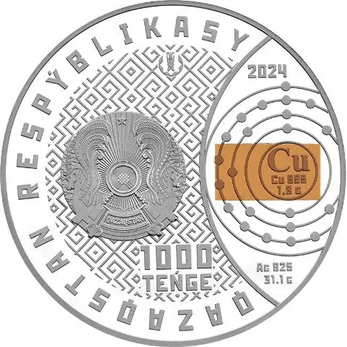 | Arka yüz açıklaması | Image of a fragment of the Periodic Table of Chemical Elements by D. Mendeleyev. On the left side is an enlarged fragment of the 29th element Copper from a copper insert Around the circle is the inscription QAZAQSTANÝN JER QOINAÝY. |
