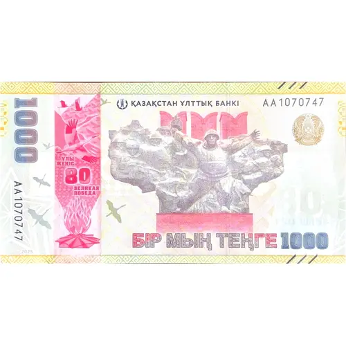 | Reverse description | Map of Kazakhstan filled with wartime soldiers and workers scenes, the Order of the Patriotic War medal. Commemorative inscriptions “Great Victory 80” and “1941–1945” in Kazakh and Russian, denomination “1000 Tenge”. |
