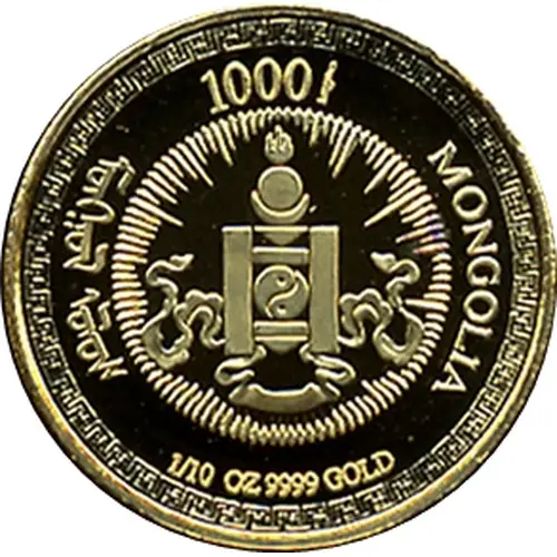 | نوشتههای روی سکه | 1000 ᠲᠥᠭᠦᠷᠢᠭ᠌ ᠮᠤᠩᠭᠤᠯ ᠤᠯᠤᠰ MONGOLIA 1*10 OZ 9999 GOLD (Translation: 1000 Tugriks Monggol Ulus (Mongolia)) |